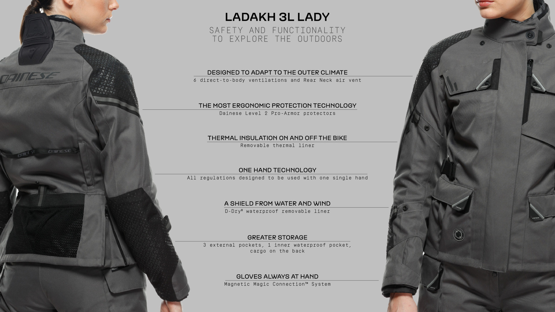 Ladakh 3L D-Dry® Lady features the integrated Dainese Magic Connection™ technology. with a magnetic system that allows compatible Dainese gloves to be secured conveniently to the jacket. so they’re always in reach and don’t get lost when refueling or during short stops.